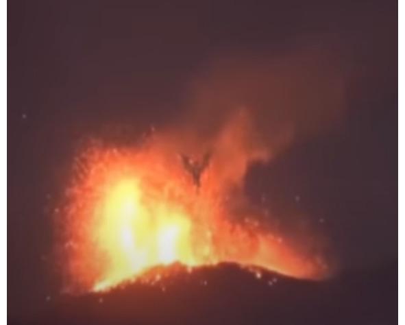 Сразу скажу, что, с моей точки зрения, эта запись фейковая. Во-первых, камера была установлена на ту точку, где «появился дракон». Более вероятно, что она была наведена на жерло периодически извергающегося вулкана. Во-вторых, «дракон» выплюнул столько огня, что расплавил породу, которая мало того что поднялась в воздух, но ещё и засыпала весь склон. Мелковат дракон для этого.
