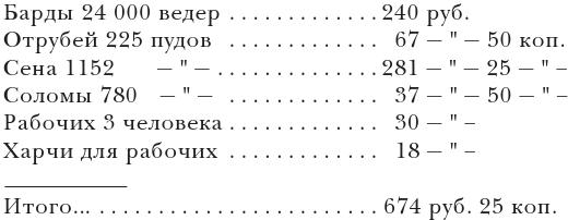 Когда скот «вопьется», то средняя норма дневного пропитания каждого быка определяется в 5–8 ведер барды и 10–15 фунтов сена.