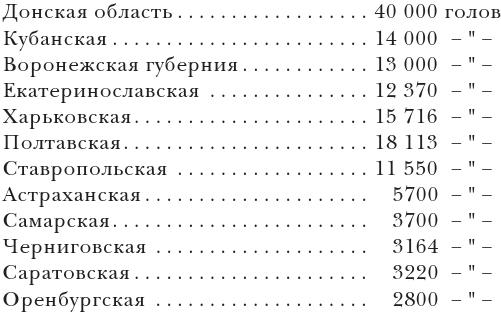 Кроме своего скота, Донская область ежегодно выкармливает на своих тучных пажитях более 30 000 голов убойного скота, вводимого прасолами из губерний Харьковской, Екатеринославской, Ставропольской, Астраханской и из области Кубанской. Принимая во внимание, что эта область дает Москве почти столько же убойного скота, как и для Петербурга, и столько же другим городам, надо допустить, что Земля Войска Донского может произвести убойного скота ежегодно свыше 200 000 голов.