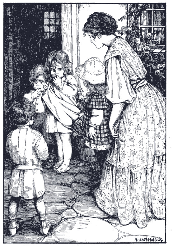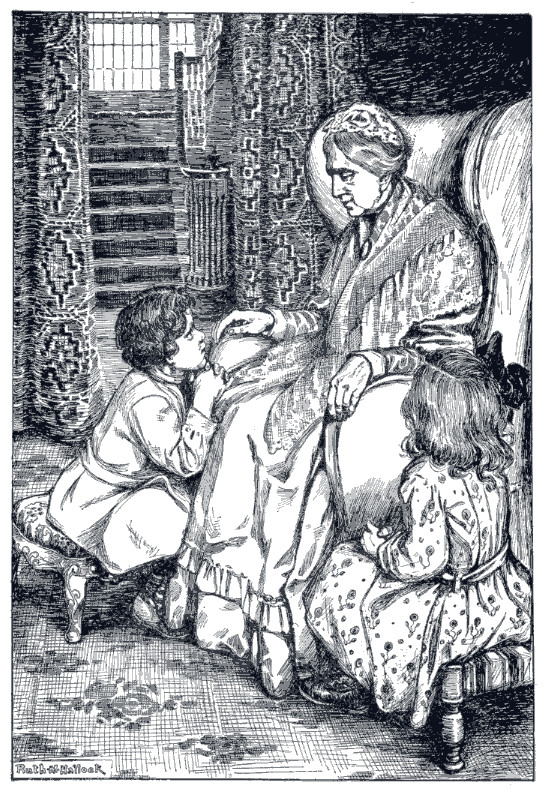 Then the two children set off running, and they flew down a long passage to the drawing-room, and were soon scrambling about a lady who was sitting working by the window.