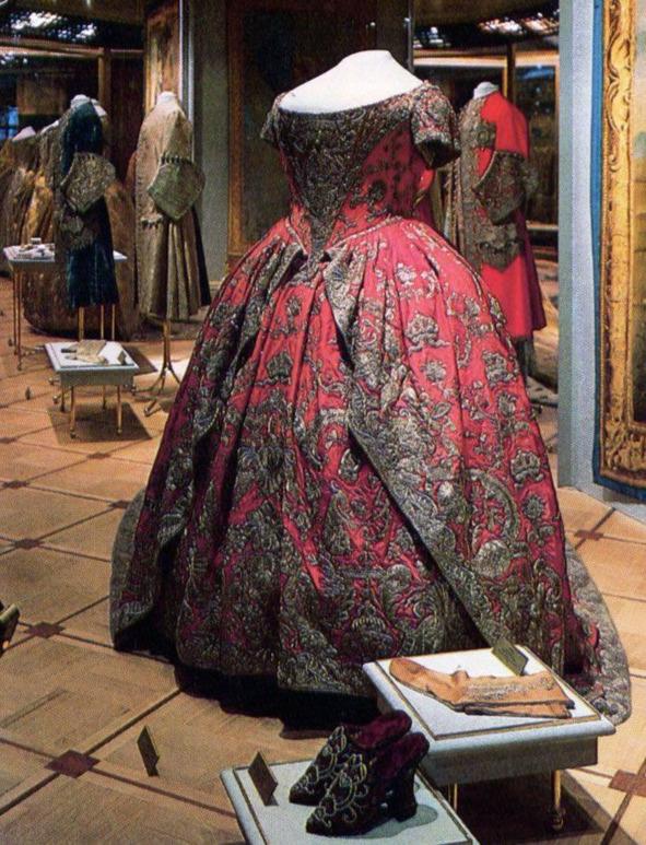 Туфли и платье (малиновая парча, расшито серебром, талия — 97 см., изготовлено в Берлине) императрицы Екатерины I к коронации 7 мая 1724 года. Петр Великий возложил корону на голову своей второй супруги в Успенском соборе московского Кремля