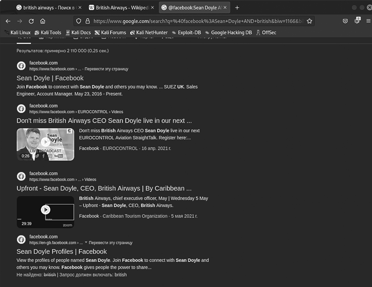 Поиск в социальных сетях. Предположим, в ходе поверхностного изучения информации о авиакомпании British Airways (Британские авиалинии) в Википедии мы узнали, что на данный момент руководство компанией осуществляет некий Шон Дойл (Sean Doyle). Поскольку это зарубежная компания, то скорее всего, ее руководство использует Facebook для коммуникации. Поиск по запросу @facebook:sean doyle выдаст нам слишком много данных: оказывается, есть много людей с таким именем и фамилией.