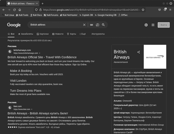 Предположим, нам нужна информация о Британских авиалиниях, для этого попробуем осуществить поиск по ключевым словам British airlines. Результат показан на рис. 3.3.