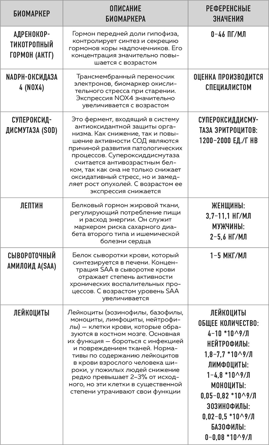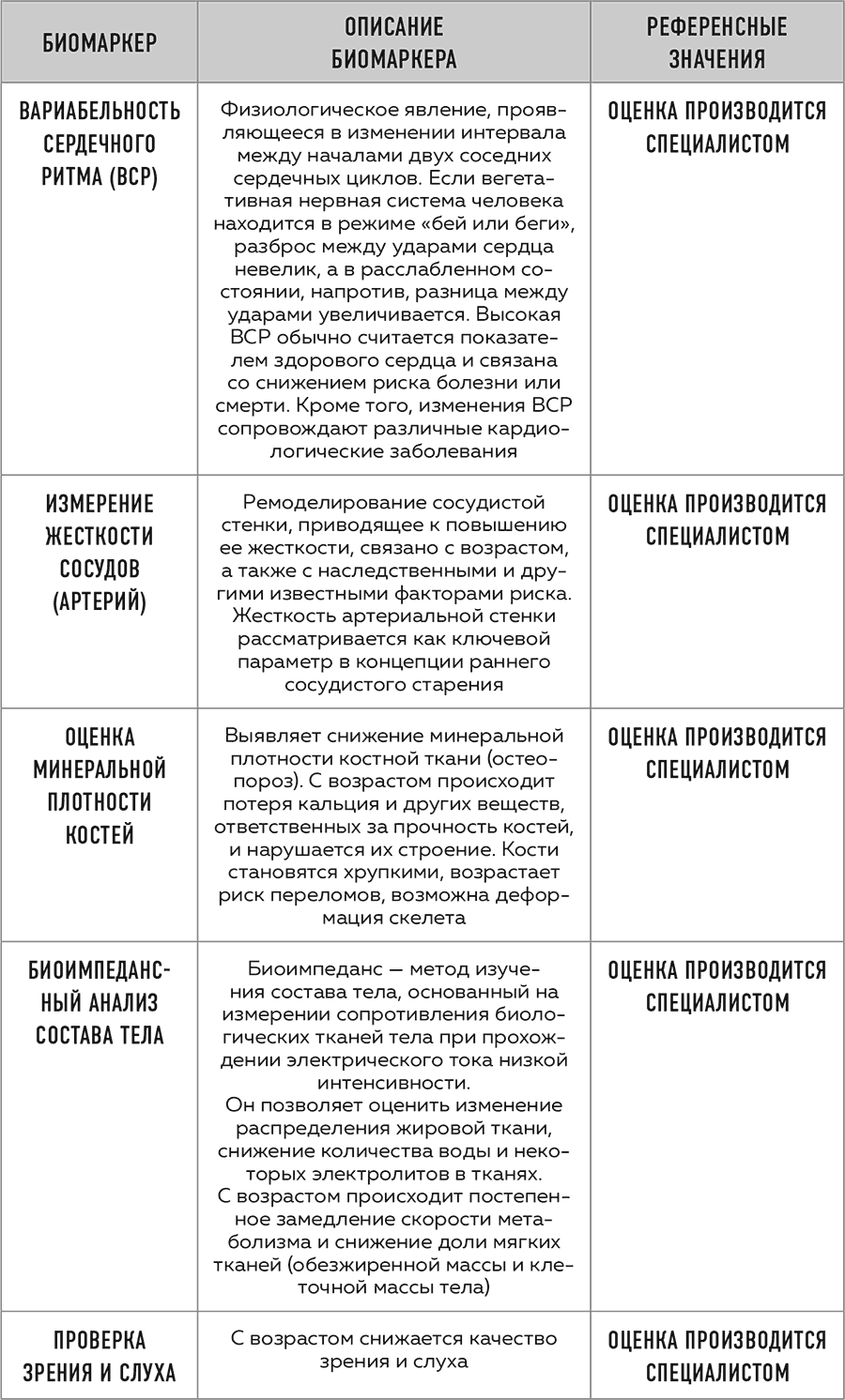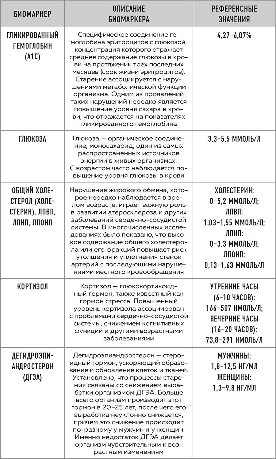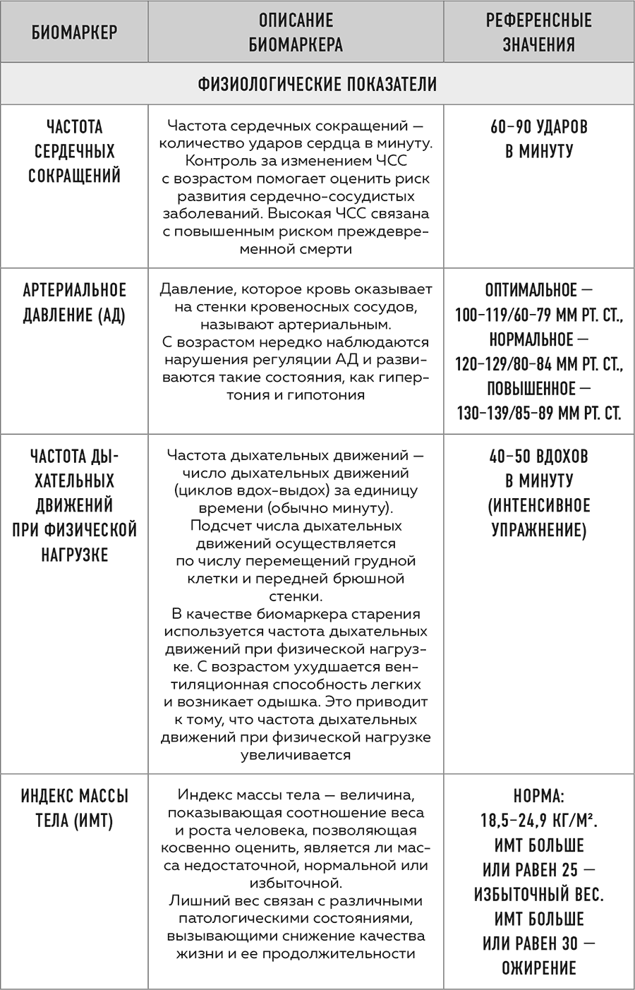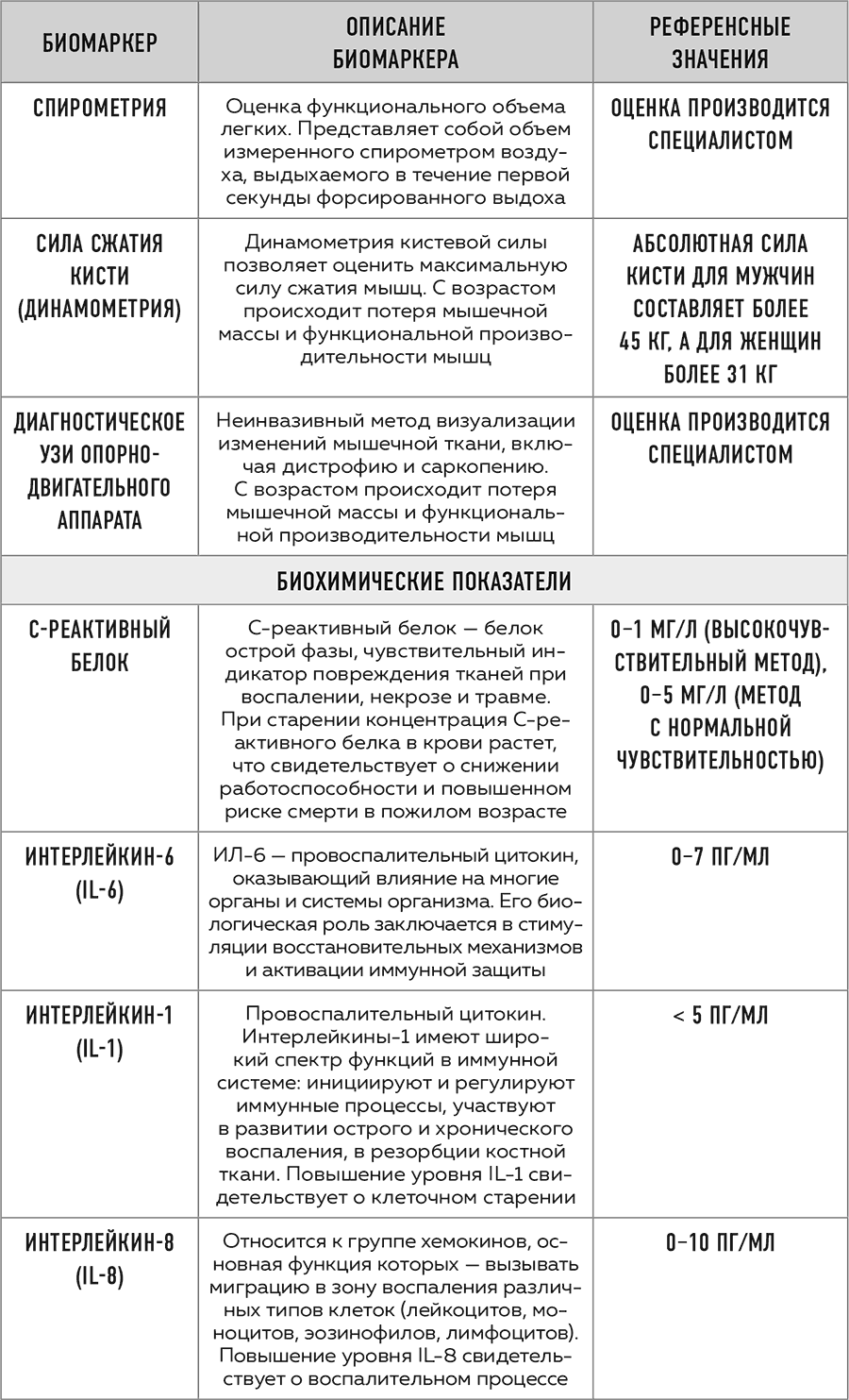 Существует такое понятие, как биомаркеры старения – совокупность физиологических и биохимических показателей, позволяющих судить о биологическом возрасте человека. Таблица с перечнем базовых биомаркеров старения приведена в конце главы.