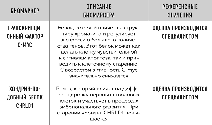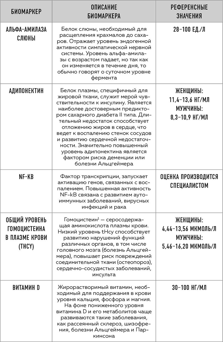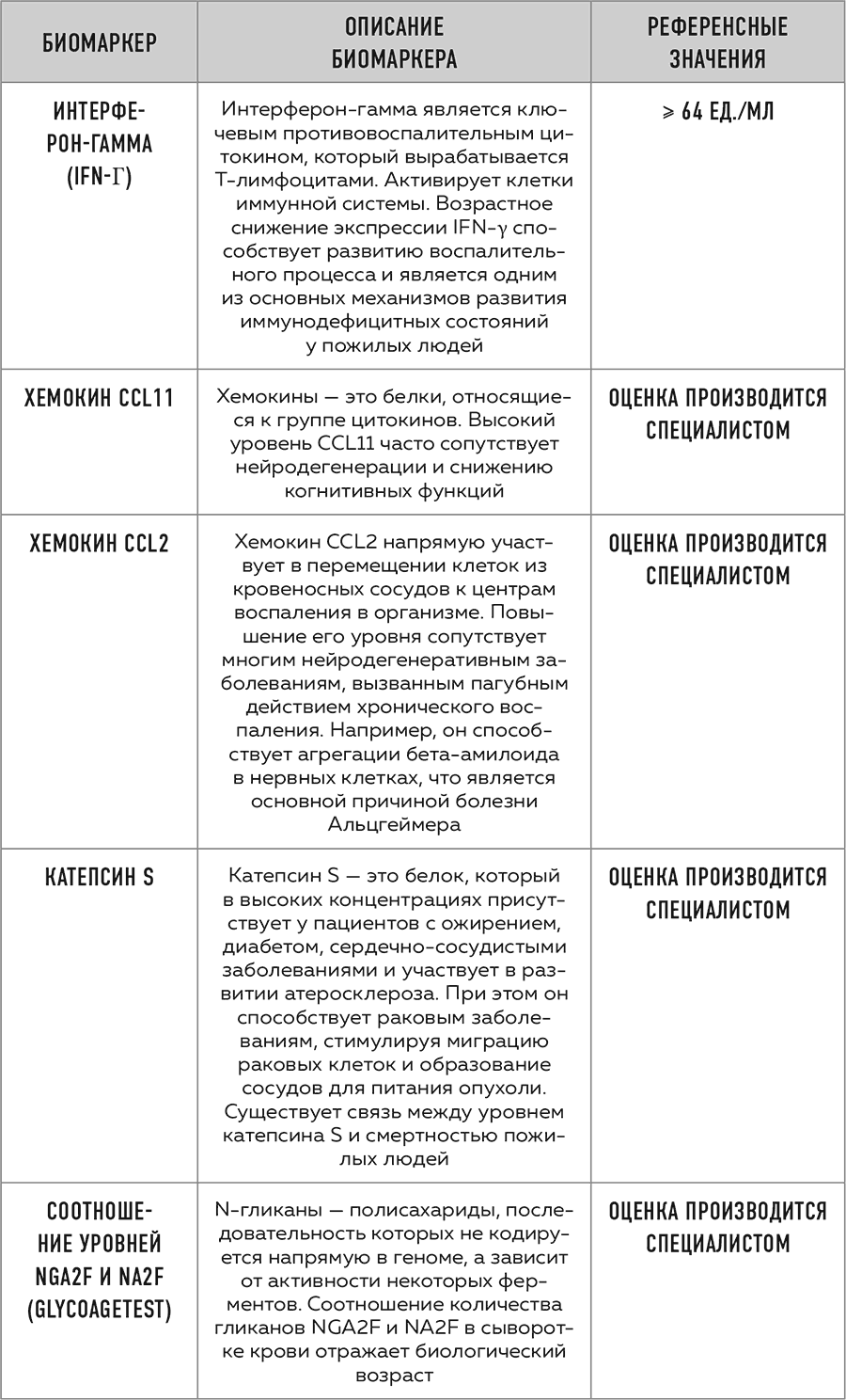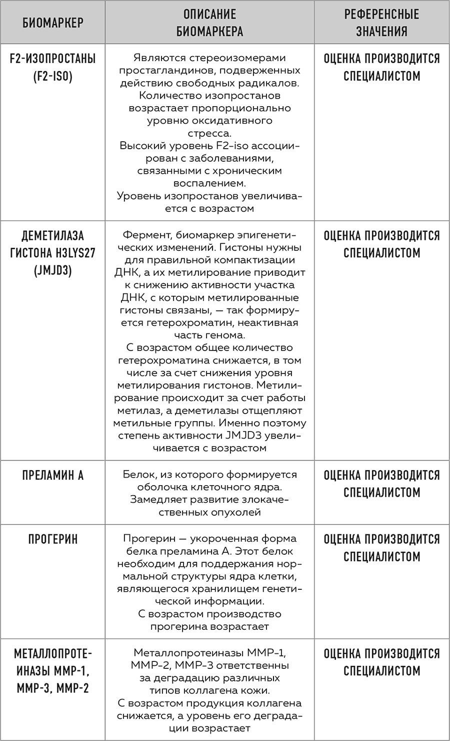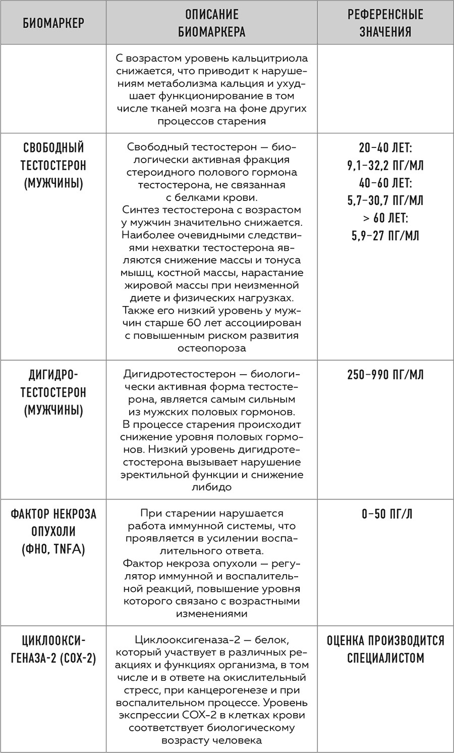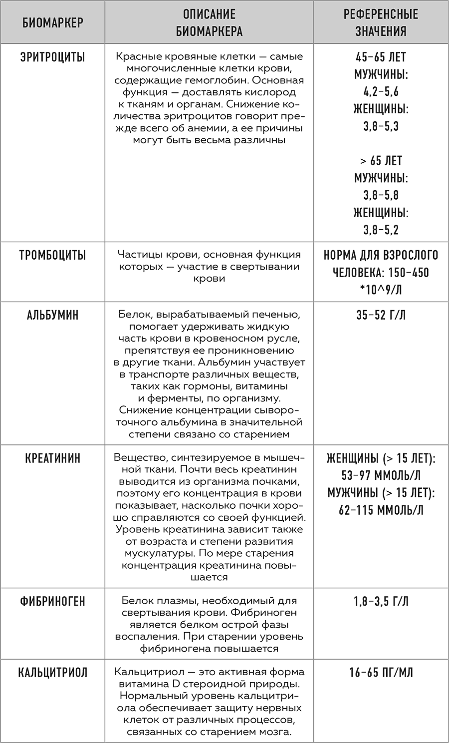 Существует такое понятие, как биомаркеры старения – совокупность физиологических и биохимических показателей, позволяющих судить о биологическом возрасте человека. Таблица с перечнем базовых биомаркеров старения приведена в конце главы.