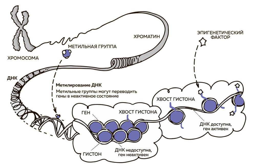 Основные пути регуляции активности генов – модификация гистонов и метилирование. Гистоны – особые белки, на которые, как на катушку, намотана ДНК в ядре клетки, что образует плотную упаковку – нуклеосому. Чем плотнее эта упаковка, тем меньше ДНК доступна для ферментов, ведущих транскрипцию – синтез РНК по матрице ДНК. А поскольку меньше РНК, постольку меньше производится белка. Это значит, что ген в этой области будет мало или вовсе не активен. Однако сигналы, получаемые из внешней для клетки среды, могут способствовать более свободному расположению этих «катушек», благодаря чему ферменты получают доступ к этому участку ДНК. Это значит, что РНК, а затем и белки могут быть синтезированы – ген активен.
