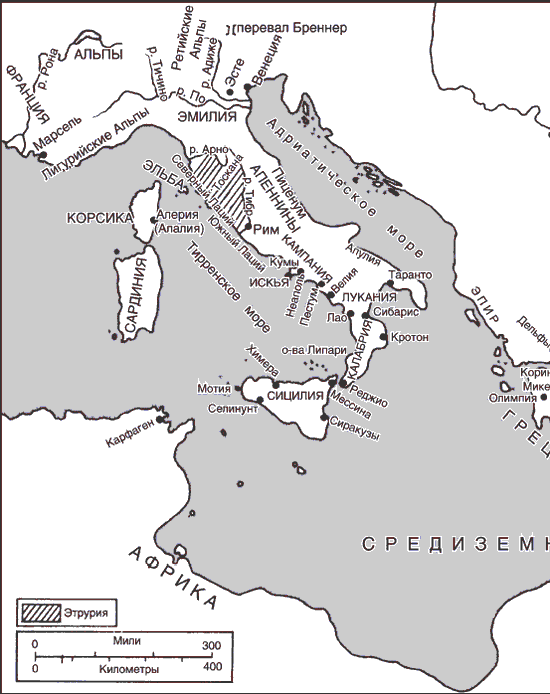 Это была родина этрусских городов-государств. К VII веку до н. э. некоторые полисы уже достигли своего расцвета, другие сохраняли свое могущество вплоть до III столетия до н. э. – периода завершения римского завоевания. Даже после утраты политической независимости этруски сохранили в I веке до н. э. свои ремесла и продолжали говорить на своем языке. В течение семи столетий кульминации своего расцвета достигла греческая цивилизация, представленная в Италии южными колониальными городами, а Римская республика выросла в самое могущественное государство в Средиземноморье.