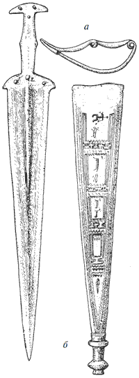 Рис. 5. а – фибула сицилийского типа; б – виллановианский меч и ножны из Тарквинии.
