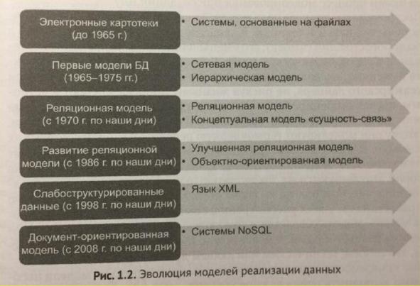 По принципу организации данных различают файловую модель, сетевую модель, иерархическую модель, реляционную модель, объектно-ориентированную модель. Краткая история представлена на Рисунке 1 [8].
