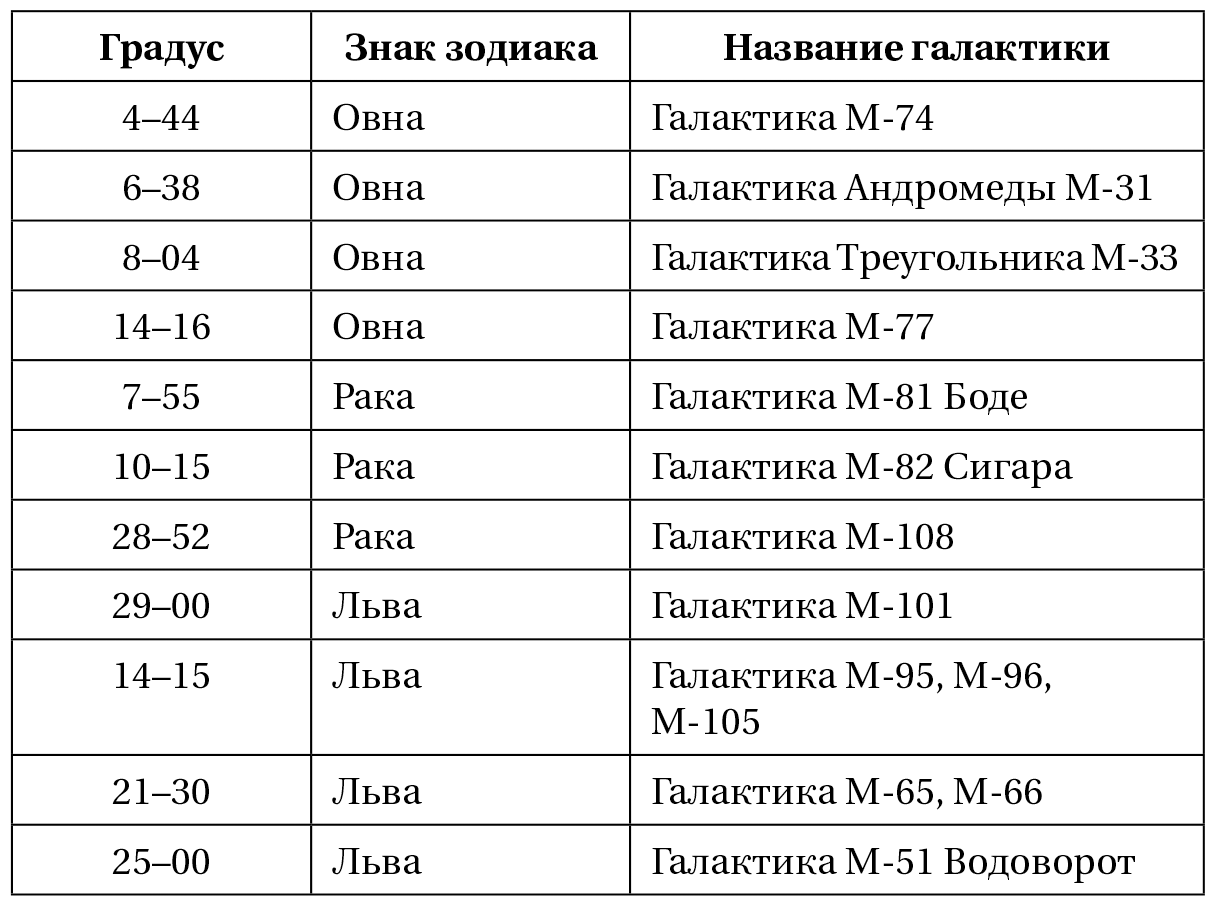 Я приведу в таблице список галактик, которые находятся относительно недалеко от эклиптики. Вы можете запомнить их и начать использовать в своей астрологической практике. Градусы указаны в сидерическом гороскопе (табл. 1).