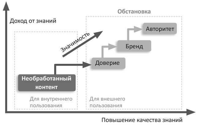 Взгляните на рисунок 1, где показано решение проблемы сырого, необогащенного контента: ось Х отражает повышение качества знаний, благодаря чему на оси Y растет доход от знаний.