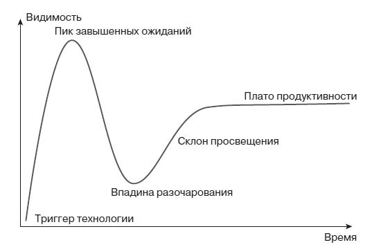 Д. Ригби, Дж. Сазерленд и Х. Такеучи написали в Harvard Business Review: «С помощью Agile удалось достичь радикальных улучшений в решении задач в ИТ-отрасли. Возможности, которые несет внедрение Agile в других корпоративных подразделениях (и направлениях), огромны». И в то же время график ажиотажа относительно Agile (рис. 1.1) показал, что мир уже находится в точке после «пика завышенных ожиданий» и продвигается ближе к «впадине разочарования».