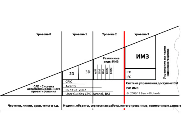 Согласно модели зрелости, предложенной Бью-Ричардсом (Bew-Richards), существует четыре уровня зрелости BIM (0—3) (Рис. 1), которые описывает весь спектр практических методов, начиная от несогласованных бумажных чертежей до полностью интегрированных цифровых и совместных рабочих процессов. Модель зрелости отражает развитие строительной отрасли в отношении применения совместной информации с вехами в процессе, которые определяются как уровни зрелости.