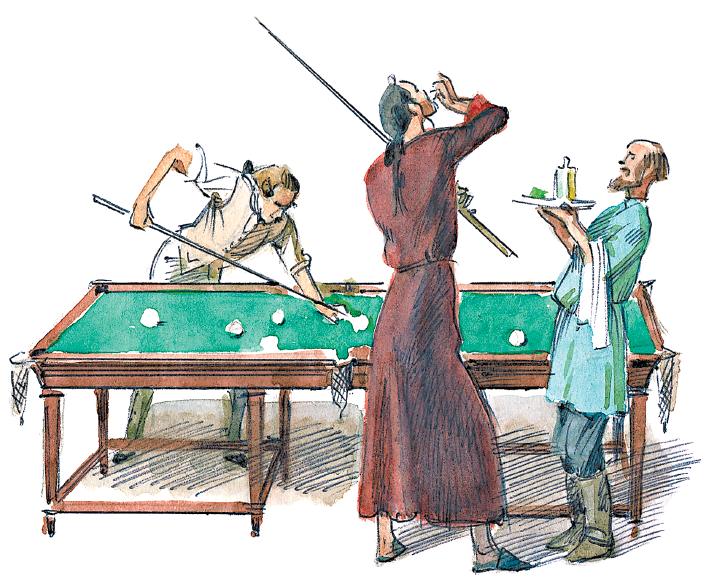 В ту же ночь приехал я в Симбирск, где должен был пробыть сутки для закупки нужных вещей, что и было поручено Савельичу. Я остановился в трактире. Савельич с утра отправился по лавкам. Соскуча глядеть из окна на грязный переулок, я пошёл бродить по всем комнатам. Вошед в биллиардную, увидел я высокого барина лет тридцати пяти, с длинными чёрными усами, в халате, с киём в руке и с трубкой в зубах. Он играл с маркёром [11], который при выигрыше выпивал рюмку водки, а при проигрыше должен был лезть под биллиард на четвереньках. Я стал смотреть на их игру. Чем долее она продолжалась, тем прогулки на четвереньках становились чаще, пока наконец маркёр остался под биллиардом. Барин произнёс над ним несколько сильных выражений в виде надгробного слова и предложил мне сыграть партию. Я отказался по неумению. Это показалось ему, по-видимому, странно. Он поглядел на меня как бы с сожалением; однако мы разговорились. Я узнал, что его зовут Иваном Ивановичем Зуриным, что он ротмистр гусарского полку [12] и находится в Симбирске при приёме рекрут, а стоит в трактире. Зурин пригласил меня отобедать с ним вместе чем бог послал, по-солдатски. Я с охотою согласился. Мы сели за стол. Зурин пил много и потчевал и меня, говоря, что надобно привыкать ко службе; он рассказывал мне армейские анекдоты, от которых я со смеху чуть не валялся, и мы встали из-за стола совершенными приятелями. Тут вызвался он выучить меня играть на биллиарде. «Это, – говорит он, – необходимо для нашего брата служивого. В походе, например, придёшь в местечко – чем прикажешь заняться? Ведь не всё же бить жидов. Поневоле пойдёшь в трактир и станешь играть на биллиарде; а для того надобно уметь играть!» Я совершенно был убеждён и с большим прилежанием принялся за учение. Зурин громко ободрял меня, дивился моим быстрым успехам и, после нескольких уроков, предложил мне играть в деньги, по одному грошу, не для выигрыша, а так, чтоб только не играть даром, что, по его словам, самая скверная привычка. Я согласился и на то, а Зурин велел подать пуншу и уговорил меня попробовать, повторяя, что к службе надобно мне привыкать; а без пуншу что и служба! Я послушался его. Между тем игра наша продолжалась. Чем чаще прихлёбывал я от моего стакана, тем становился отважнее. Шары поминутно летали у меня через борт; я горячился, бранил маркёра, который считал бог ведает как, час от часу умножал игру, словом – вёл себя, как мальчишка, вырвавшийся на волю. Между тем время прошло незаметно. Зурин взглянул на часы, положил кий и объявил мне, что я проиграл сто рублей. Это меня немножко смутило. Деньги мои были у Савельича. Я стал извиняться. Зурин меня прервал: «Помилуй! Не изволь и беспокоиться. Я могу и подождать, а покамест поедем к Аринушке».