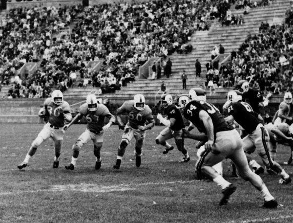 Билл (67) проводит блокировку в составе команды Колумбийского университета в победном матче Lions против Гарварда со счетом 26:14, 21 октября 1961 года. {3}