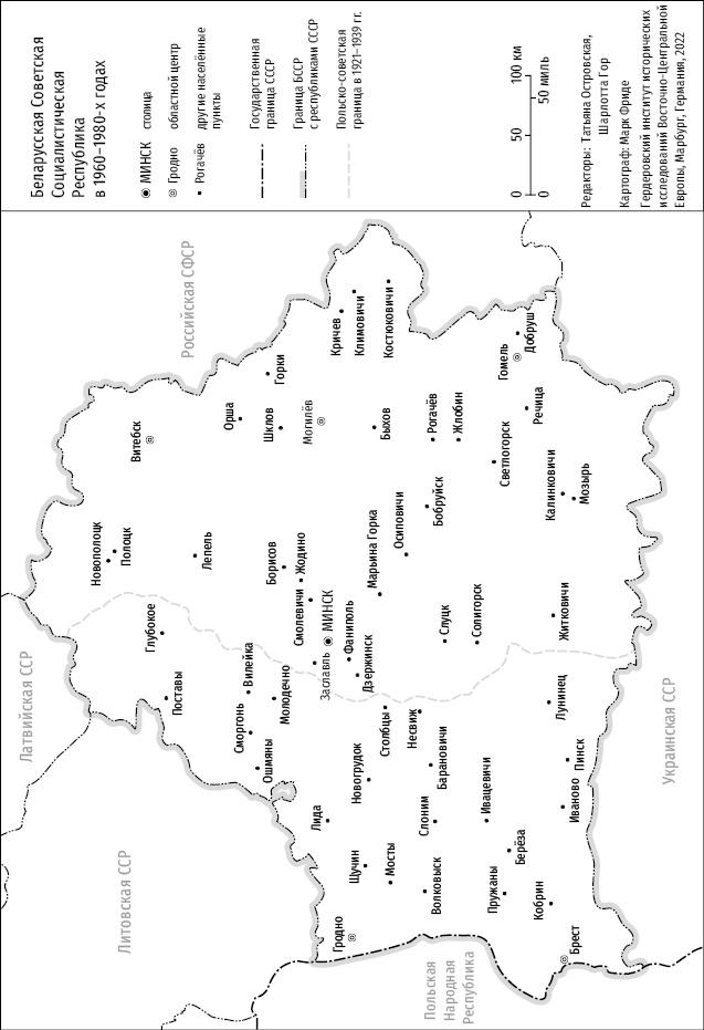 Я благодарю моих друзей и коллег за разностороннюю поддержку. Вот лишь некоторые имена: Таня Артимович (Таня Арцімовіч), Алина Баравикайте (Alina Baravikaite), Виталь Быль (Віталь Быль), Владимир Володин (Уладзімір Валодзін), Константин Ерусалимский, Инге Кристенсен (Inge Christensen), Ольга Демидова (Вольга Дзямідава), Марта Гжечник (Marta Grzecznik), Игорь Иванов (Ігар Іваноў), Антон Левицкий (Антон Лявіцкі), Саймон Льюис (Simon Lewis), Маттиас Мюллер (Matthias Müller), Виктория Осипчик, Оксана Остапчук, Ирина Романова, Ольга Сасункевич, Селина (Selena) и Марко Смилянич (Marko Smiljanic), Юлия Штромайер (Julia Strohmeyer), Тильман Платт (Tilman Platt), Кристиан Вустрау (Christian Wustrau). Также я благодарна моим коллегам из Гердеровского института исторических исследований Восточно-Центральной Европы в Марбурге (Herder Institute for Historical Research on East Central Europe in Marburg): директору института Петеру Хаслингеру (Peter Haslinger), моей руководительнице Хайди Хайн-Кирхер (Heidi Hein-Kircher), а также Анне Веронике Вендланд (Anna Veronika Wendland), Ксении Бржезицкой-Станицкой (Ksenia Stanicka-Brezicka), Славеку Бржезицкому (Sławomir Brzezicki), Элизе-Марии Химер (Elisa-Maria Hiemer), Денисе Нештяковой (Denisa Nešťáková). За работу над картой, опубликованной в этой книге, я признательна Кристиану Лотцу (Christian Lotz), Марку Фриде (Marc Friede) и Шарлотте Гор (Charlotte Gohr). Кристина Гороль (Christina Gorol) познакомила меня с архивом фото- и видеодокументов Гердеровского института. Ян Липинский (Jan Lipinsky) любезно поделился своими знаниями о коллекциях самиздата.