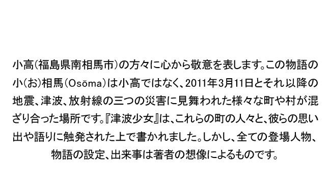 Город Осома, о котором рассказывается в этой истории, — ни в коем случае не Одака. Это собирательный образ разных городков и деревенек, которые 11 марта 2011 года (и позже) пережили сразу три страшные катастрофы: землетрясение, цунами и радиационное загрязнение.