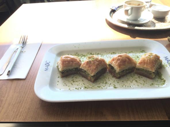Почитал меню, лежащее на столике — цены были приличными, начинались от десяти долларов. Совсем не макдональдс. Решил быстро перекусить пахлавой — надо же, наконец, съесть фирменное блюдо (тогда было неясно, что фирменно блюдо тут — это мороженое). Просто пахлава обошлась как раз долларов в десять (885). Между тем, все остальные посетители поглощали классические завтраки долларов под двадцать-тридцать. Почувствовал себя бедным.