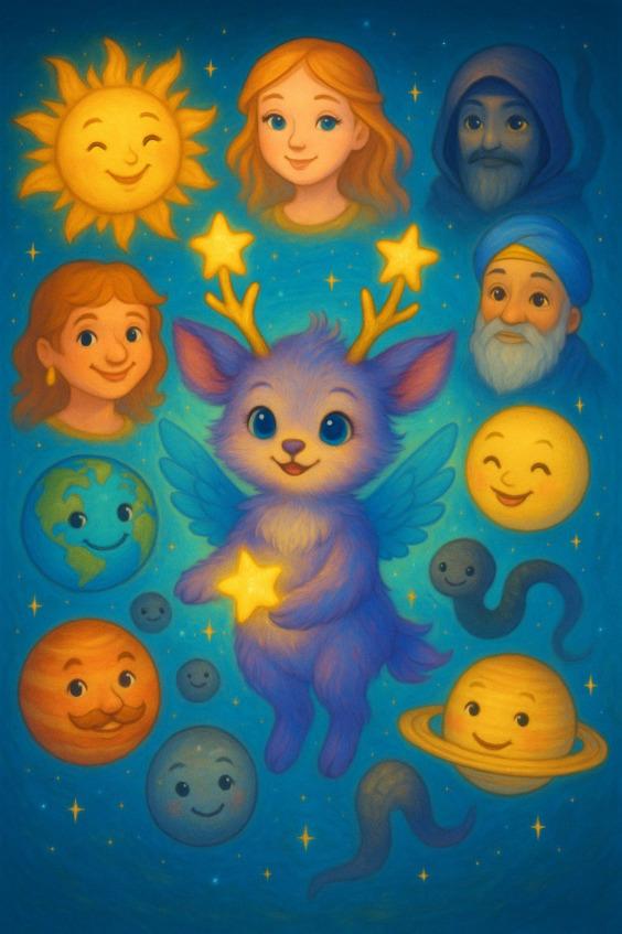 Привет, чудо-дитя! Меня зовут Твиша. Я живу среди звёзд и летаю по небесным тропинкам. Там, где ты видишь сияние на небе — это мои друзья, волшебные светила, которых зовут планетами Джойтиш. Их девять, и у каждой — своя тайна, своя сила и своя песенка.