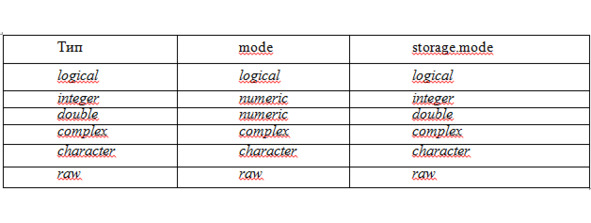 R имеет шесть основных («атомарных») типов векторов: logical, integer, real, complex, string (or character) и raw. Режим и режим хранения для разных типов векторов перечислены в следующей таблице.
