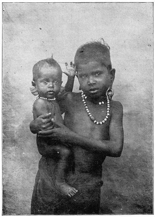 The Kādirs carry loads strapped on the back over the shoulders by means of fibre, instead of on the head in the manner customary among coolies in the plains; and women on the march may be seen carrying the cooking utensils on their backs, and often have a child strapped on the top of their household goods. The dorsal position of the babies, huddled up in a dirty cloth, with the ends slung over the shoulders and held in the hands over the chest, at once caught my eye, as it is contrary to the usual native habit of straddling the infants across the loins as a saddle.