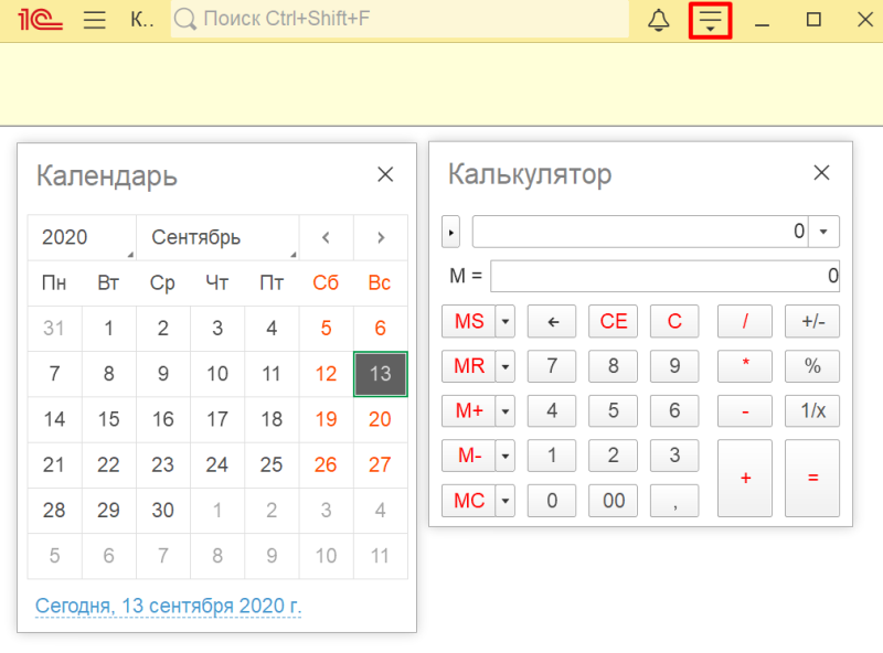 Запустится окно режима «1С:Предприятие». Система автоматически сформирует для пользователя форму, а также добавит некоторые дополнительные функции, например, калькулятор и календарь. Их можно вызвать при нажатии на кнопку, выделенную рамкой.