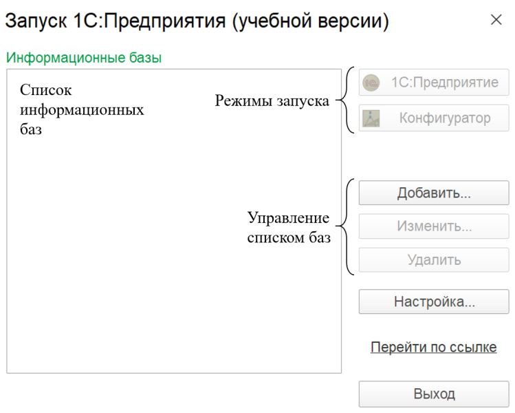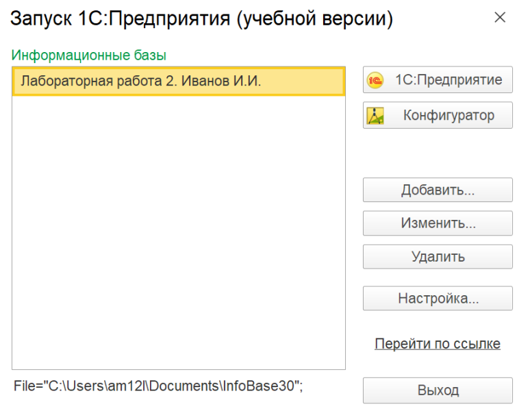 Запустите учебную версию 1С:Предприятия. Перед вами появится окно запуска.