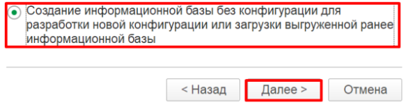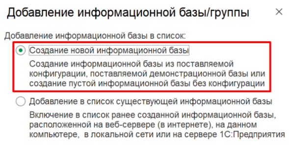 Откроется окно добавления информационной базы/группы. Выберите вариант создания новой информационной базы и нажмите на кнопку «Далее».