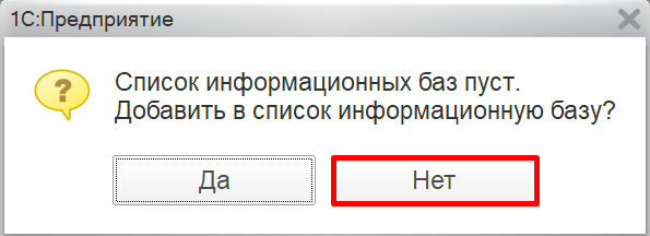 Запустим программу. При первом запуске система предложит добавить новую информационную базу, но мы этого делать не будем.