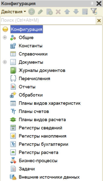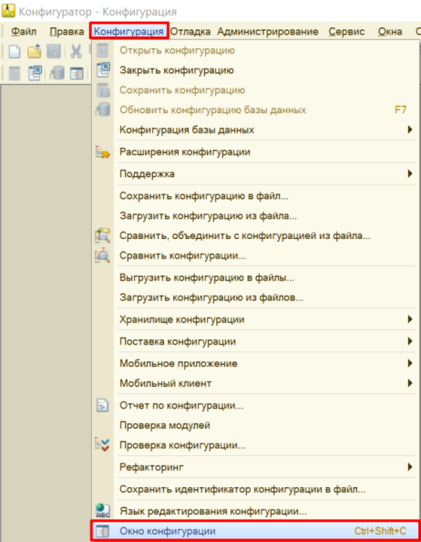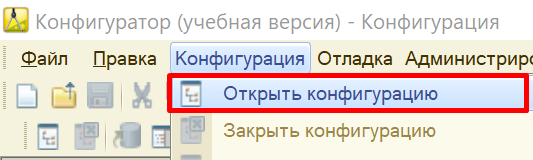 Для разработки информационных баз нам понадобятся специальные объекты. Чтобы их включить, необходимо выбрать пункт меню «Конфигурация» ? «Открыть конфигурацию».