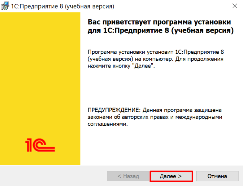 Откроется окно установки 1С:Предприятия. Нажимаем на кнопку «Далее»: