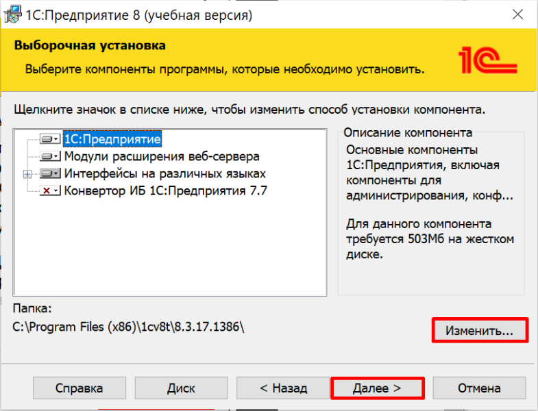 Проверьте, что компонент «1С:Предприятие» не отмечен знаком «крестика»!