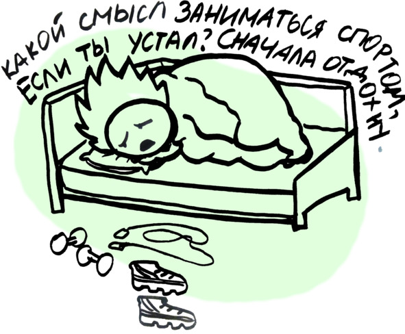 Когда мы уменьшаем количество своих обязанностей и становится нужно меньше энергии, чем надо было раньше, мозг это регистрирует и начинает… генерировать энергии ровно столько, сколько нам нужно сейчас при сниженной активности. Казалось бы — меньше работаем и больше отдыхаем, у нас должно быть больше сил. Но это работает наоборот. И из этого состояния сложно выйти — мозг перестанет отпускать нам количество энергии, и мы так и остаемся лежать на диване.