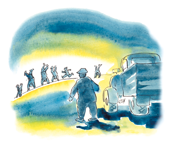 Марен, Мартин, Марта, Мадс и Мона вскочили с места и встали на руки. Потом упали и снова встали. Милли и Мина покатились по земле, как будто перекувырнулись через голову, а Мортен встал на четвереньки, просунул голову между ногами и поглядел назад. Свет фар упал ему на лицо, и не заметить его было уже невозможно. Впрочем, и остальных тоже. Автомобиль остановился, и Уле-Александр крикнул детям:
