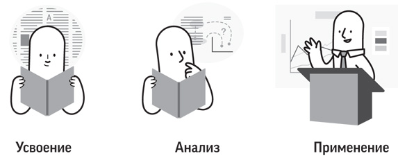 Только после того как информация усвоена и проанализирована, мы можем работать с ней по-настоящему — применять свои знания. Например, принимать решения, консультировать коллег, выступать с презентацией, писать статью или давать интервью. В процессе обработки информации выделяются три этапа: усвоение, анализ и применение знаний.