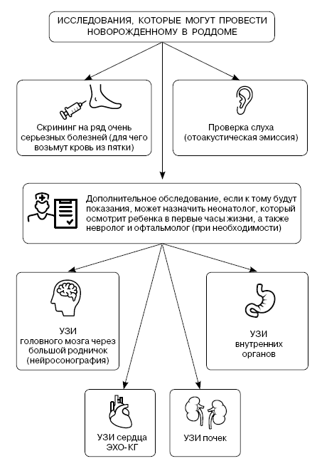 Примечание. Если первые два обследования не сделали в роддоме, то кровь для скрининга должна взять на дому медсестра из поликлиники, а слух надо проверить в поликлинике в кабинете лор-врача.