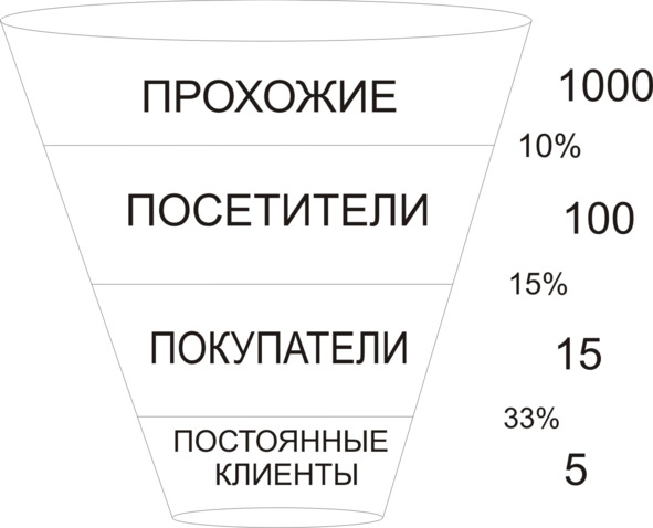 Наверху находятся те люди, которые не являются на данный момент Вашими покупателями — это прохожие. Для примера возьмём количество — 1000 человек в день проходят около Вашей торговой точки.