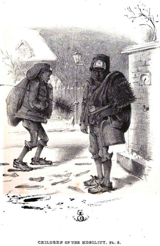 Behold those two chimney-sweeps; glance at their attire and their complexions; and think for one moment of the state of the thermometer. Who does not remember, among the legends of his earlier days, a pathetic but harrowing story of an interesting child who was stolen, in a highly fashionable neighbourhood, from under the maternal roof, and subsequently brought up by his kidnappers to the sooty employment of Masters White and Baggs? The touching conclusion of the tale, where the young gentleman comes at last to sweep his own Mamma's chimney, has beguiled many a fair eye of a pearl or two. Is it possible,—can it be,—that we may have too hastily included those youths among the Children of the Mobility; and that they also may have been snatched, by some felonious hand, from the mansions of their distinguished,—perhaps noble parents? Can we have unwittingly indulged in a smile at aristocratic misfortune? No, no; away with such a fear! Instinct, as unerring as that which at once enabled the tender mother to recognise her disguised cherub, would have revealed to us lustre of birth in spite of obscurity of skin. Whatever may be the similarity of their external circumstances, there is always an essential difference, which we filter ourselves we can instantly detect, between patricians and plebians, Cholmondeleys and Chummies.