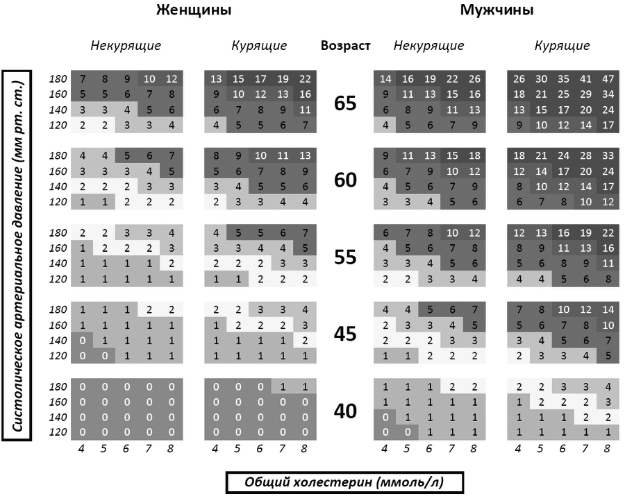 Теперь сопоставим имеющиеся у нас данные. Числа в клеточке соответствуют проценту вероятности смертельного исхода от инфаркта, инсульта или другой сосудистой катастрофы в ближайшие 10 лет.