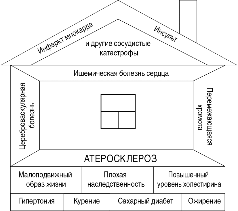 С чего начинается строительство любого дома? Правильно, с фундамента. И таким фундаментом у нас выступают факторы риска. Блоки фундамента – это гипертония, повышенный уровень холестерина, курение, ожирение, сахарный диабет, малоподвижный образ жизни, плохая наследственность. Построили фундамент? Сверху ложится большая плита. Это пол нашего дома, который называется атеросклероз – сужение сосудов за счет образования в них холестериновых бляшек. Самое здание дома – это сердечно-сосудистые заболевания (ишемическая болезнь сердца, цереброваскулярная болезнь, перемежающаяся хромота), то есть клинически выраженный атеросклероз. Бляшка растет, просвет сосуда сужается, и крови к органам поступает все меньше. Когда сужается коронарная артерия и сердце не получает достаточного количества крови, развивается стенокардия. Если поражаются сосуды в ногах, что особенно часто происходит у курильщиков, тогда появляется перемежающаяся хромота.