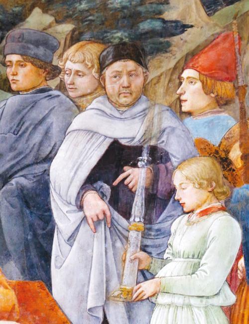 Коренастая фигура в монашеском облачении, смотрящая в упор на зрителя, – это автопортрет фра Филиппо Липпи. Стоящие рядом юноши – его ученики фра Диаманте и Пьерматтео д’Амелиа. На этой фреске они – будто бы часть толпы, присутствующей при смерти Девы Марии. Стоят они на достаточно почетном месте – в изножии ее ложа (в то время как апостолы, настоящие свидетели ее Успения, изображены у изголовья). Для средневековых и ренессансных итальянских художников манера вставлять портреты заказчиков и собственные автопортреты в изображения толпы на больших фресковых циклах была совершенно нормальной. При этом заказчики обычно изображаются в профиль, обращенными к Богу и святым, а вот художники общаются с нами, зрителями.