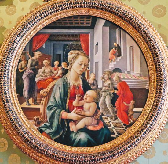 Эта картина – пример из числа более ранних «Мадонн» фра Филиппо Липпи, чем «Ла Липпина», однако для своего времени она тоже была новаторской. На заднем плане художник поместил архитектурный фон, а также два сюжета из жития девы Марии: справа – встреча ее родителей Иоакима и Анны у Золотых ворот (т. е. ее зачатие), а слева – ее рождение Анной. Второстепенные женские персонажи одеты в шелковистые одеяния, облегающие фигуры и струящиеся от ветра, – это самое раннее появление мотива, который станет для флорентийского искусства одним из любимых. Женщина с корзиной на голове также станет сквозным персонажем.