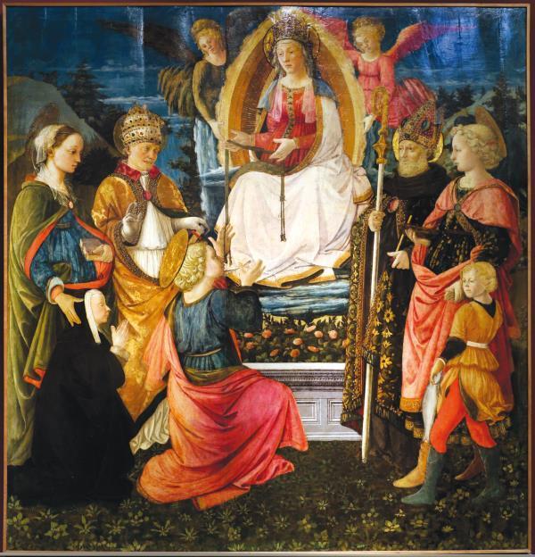 Фра Филиппо Липпи и фра Диаманте. «Мадонна делла Чинтола» («Мадонна в Успении, дающая свой Пояс св. Фоме, со свв. Григорием, Маргаритой, Августином, архангелом Рафаилом и Товией»). 1456–1460 гг. Городской музей (Прато)