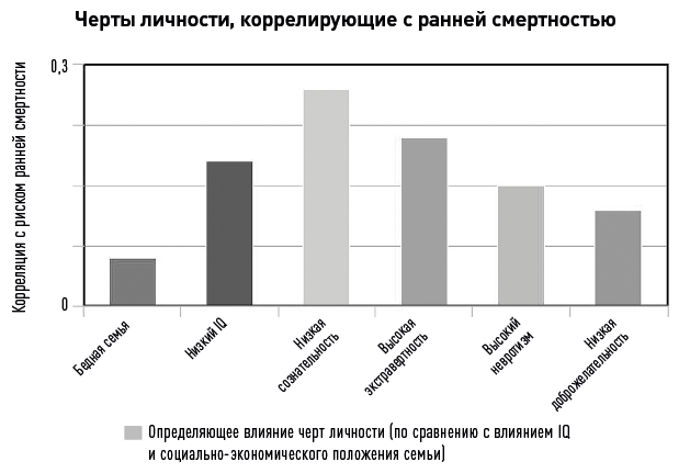 Важность роли черт личности подтверждается данными об их корреляции с показателями риска ранней смертности. Приведенная диаграмма основана на результатах десятков исследований с участием тысяч добровольцев.