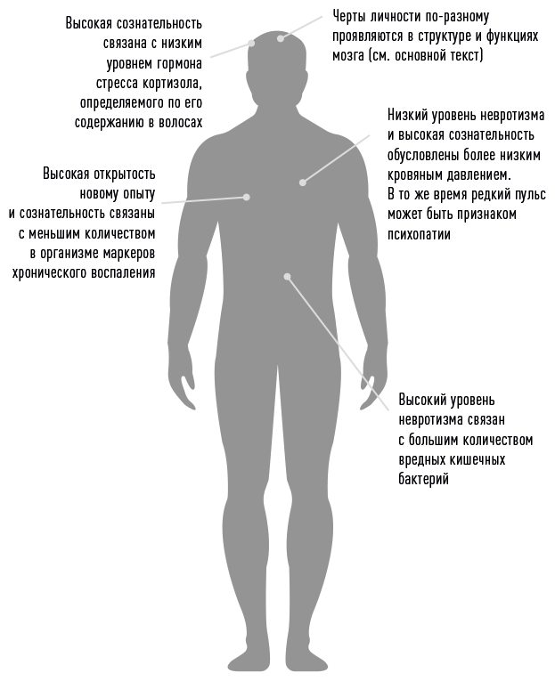 Принято считать, что понятию «личность» невозможно дать определение, что рассматривать его можно только на основе описательного подхода, но на самом деле оно очень точно отражает биологическую структуру своего носителя, вплоть до устройства и функционирования мозга. Например, стремление к тишине и покою для интровертов не просто прихоть — их мозг более чувствителен к громким звукам. Эмоционально неустойчивые невротики чаще страдают от перепадов настроения не потому, что им этого хочется, а из-за меньшего количества складок и, соответственно, меньшей площади поверхности коры головного мозга в зонах, отвечающих за регулирование эмоций [10]. У людей с ярко выраженными благоприятными чертами, такими как эмоциональная устойчивость и сознательность, миелиновые оболочки нейронов в переднем отделе мозга более плотные и проводимость электрических сигналов, а значит, и эффективность взаимодействия нервных клеток выше [11]. Факторы, определяющие личность, напрямую связаны даже с микробиомом желудка — у невротиков количество вредных кишечных бактерий в нем намного больше [12].