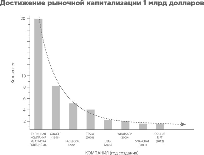 Просчеты в стиле Iridium и эпохальная смена лидеров в фотоиндустрии с Kodak на Instagram не были изолированными событиями. Сегодня ведущие американские компании из списка Fortune 500 сталкиваются с конкуренцией не только и не столько со стороны крупнейших китайских и индийских компаний. Как верно заметил Питер Диамандис, их конкурентами все чаще становятся стартапы, которые создаются умными парнями в своих гаражах и грамотно используют технологии экспоненциального роста. Сервис YouTube вырос из стартапа, который был создан на личные средства Чада Херли, и менее чем за полтора года завоевал такую бешеную популярность, что был приобретен Google за 1,4 млрд долларов. У Groupon период от задумки до компании стоимостью 6 млрд долларов занял менее двух лет. Самый дорогой стартап в мире Uber сегодня оценивается почти в 17 млрд долларов, что в десять раз превышает его стоимость всего два года назад. Мы видим новый тип организаций, которые растут и генерируют стоимость со скоростью, доселе невиданной в мире бизнеса. Приведенный график наглядно показывает ускоряющийся метаболизм экономики.
