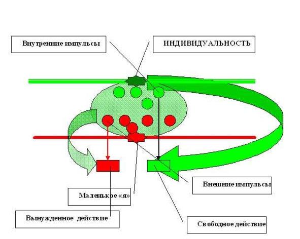 Другая структура — это наше маленькое «я». Оно образовано как раз элементами внешнего мира, соединенными в более или менее целостную Картину мира, которую мы сами рассматриваем как воплощение нашей ИНДИВИДУАЛЬНОСТИ. Определенный смысл в этом есть — Картина мира каждого действительно индивидуальна, но вся проблема в том, что она лишена внутренней основы. Каждый её элемент гораздо сильнее связан с внешним миром, чем с нашей ИНДИВИДУАЛЬНОСТЬЮ, поэтому наше «я» зависит от «внешних импульсов» и подчиняется им, следуя заданной программе. А эта программа всегда противоречит тем «внутренним импульсам», которые исходят из нашей ИНДИВИДУАЛЬНОСТИ — как раз та разница между свободным и вынужденным действием, о которой мы говорили.