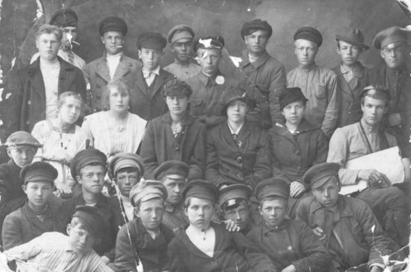 А вот группа рабфаковцев, которую я разместил на обложке первого тома. Я много раз вглядывался в это фото, разглядывал лица, рассматривал одежду… Отдельного внимания заслуживают головные уборы: картузы, фуражки и кепки у ребят, шляпки у девушек. Интересно, что из мужчин один-единственный без головного убора: Николай Белкин. Почему? Было ли это демонстрацией некой свободы, или данью только входившей новой моде? Очень хорош преподаватель: в военной гимнастерке, с какими-то чертежами…