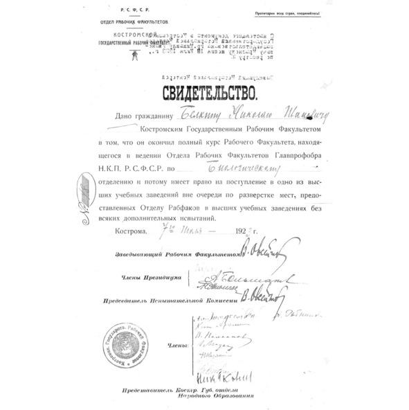 Дано гражданину Белкину Николаю Ивановичу Костромским Государственным рабочим факультетом в том, что он окончил полный курс Рабочего Факультета, находящегося в ведении Отдела Рабочих Факультетов Главпрофобра Н. К. П.Р.С.Ф.С.Р. по биологическому отделению и потому имеет право на поступление в одно из высших учебных заведений вне очереди по разверстке мест, предоставленных Отделу Рабфаков в высших учебных заведениях без всяких дополнительных испытаний.