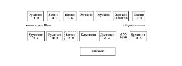 На схеме пунктиром изображён дом Константина Никаноровича, в котором жили в начале XX века все наши предки. Там же родился и мой папа, Николай Иванович, и его сёстры. Новый дом, построенный дедушкой Иваном, стоял с краю деревни. Сейчас его контур отмечен зарослями высокой крапивы, среди которой можно разглядеть мелкие осколки красного кирпича. В том же ряду стояли дома Василия Константиновича и его сына Ивана, погибшего на Великой Отечественной войне. Замыкает ряд дом Александра Васильевича Румянцева, чью фотографию когда-то сделал папа. Она сохранилась у Сергея.
